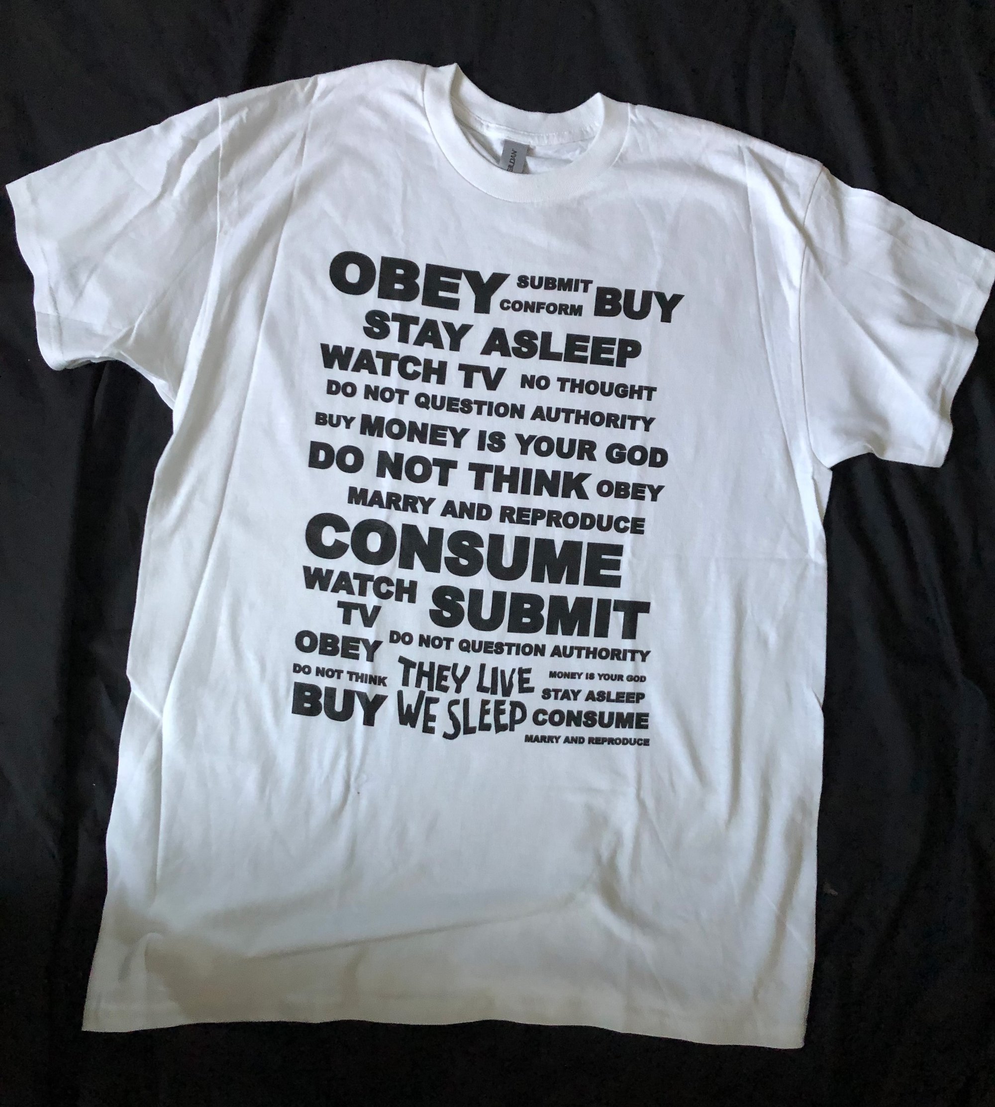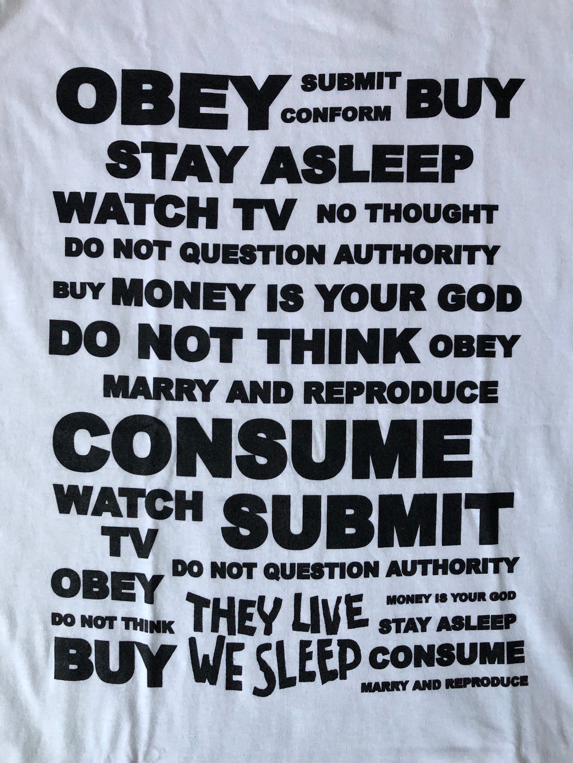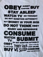 This simple white shirt with black ink features the hidden messages from the movie They Live. It is a reflection of how we consume things as a society.